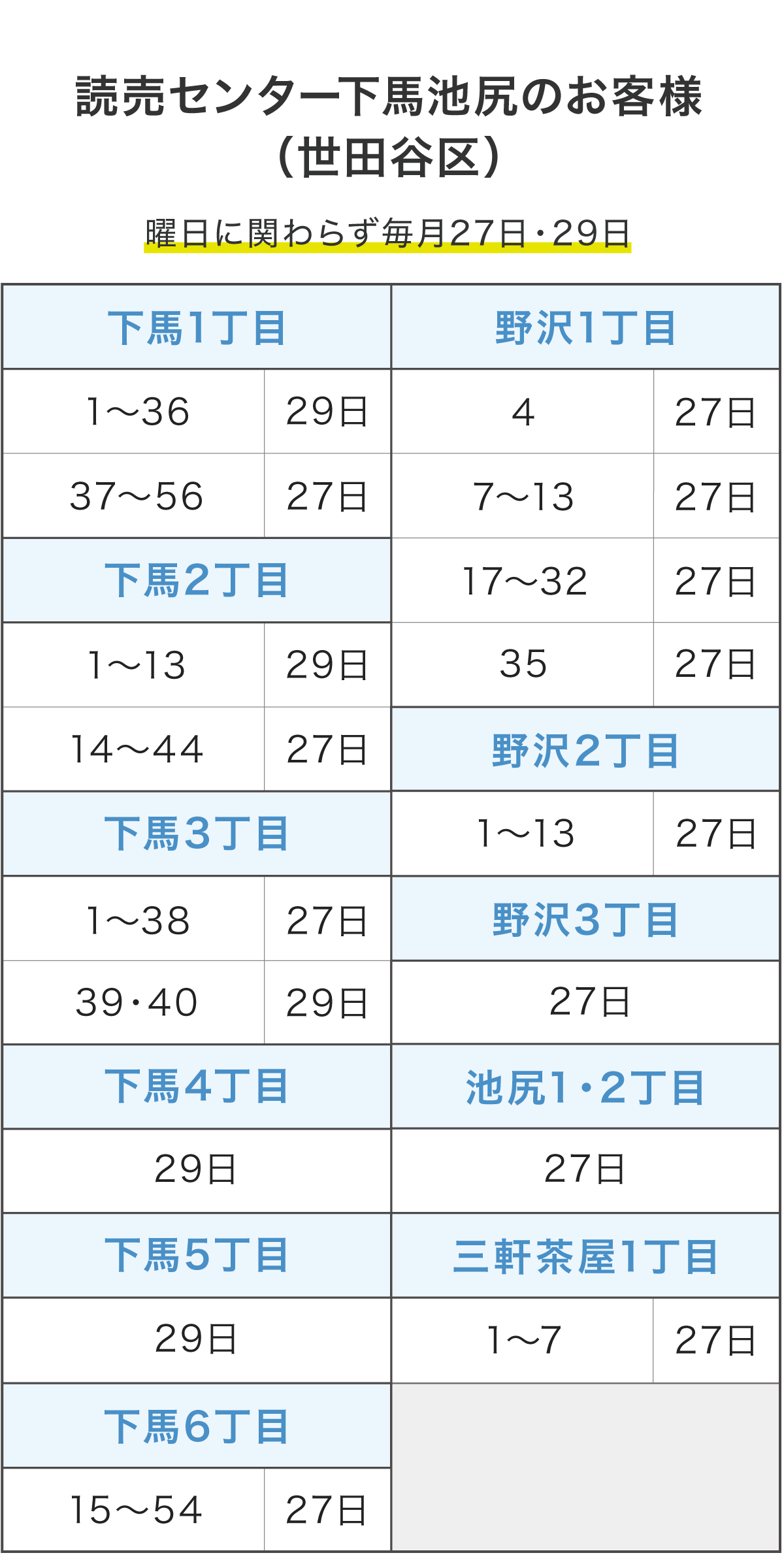 読売新聞購読者さま限定で、古紙回収をおこなっております。お住まいの地域によって回収日が異なりますので、下記の表をご確認ください。